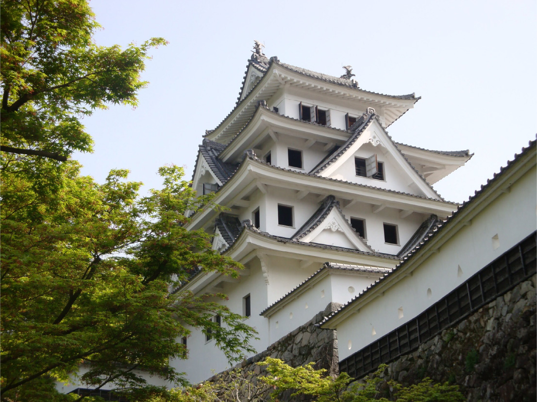 司馬遼太郎『街道をゆく』にも紹介されていて、町を一望できる八幡山の山頂にそびえ立つ格調高い山城。土佐藩初代藩主・山内一豊の妻であり、「内助の功」として知られる見性院(千代)は、初代城主である遠藤盛数の長女であるとされていて、司馬氏の小説『功名が辻』にも登場する。